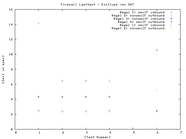 Wie erwartet steigt die Zeit linear mit der Zahl der Regeln. Die Firewall muß einfach mehr Regeln durchgehen. Allerdings unterscheidet die Firewall nach Interface und Richtung des Verkehrs. In unserem Fall ist die Richtung inbound über das secIF mit sehr vielen Regeln befrachtet - die anderen Richtungen bzw. Interfaces erleben einen Anstieg, der der Last der Maschine entspricht.
