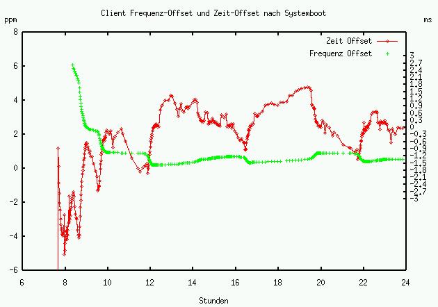 Am nächsten Tag ist es deutlich besser. Für einen Client ist das in Ordnung, der Zeit-Offset ist im Bereich von 2 ms, der Frequenz-Offset bis auf einen Ausreißer deutlich unter 0.5 ppm, keine heftigen Schwankungen. Der Zeit-Offset liegt um eine ms, man würde sich nur wünschen, das es alles etwas runder, weniger betont, geht.